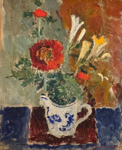This is a moody, abstract, oil on board painting of a floral arrangement in a chinoiserie vase. The signature reads S. Ernkvist and is dated 1963. The colors are rich and dark and this painting would work excellent on a gallery wall or as a stand alone piece.
