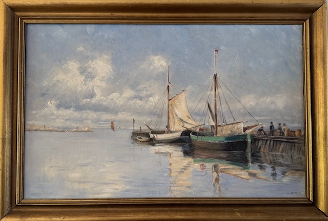 Antique, signed oil on canvas of boats in harbor and people on dock. The painting is signed with initials that are attributed to Elizabeth Zanderson (EZ).