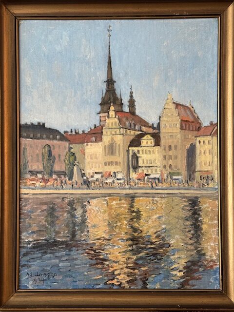 Beautiful oil cityscape of Stockholm’s old town (Gamla Stan), also reflected in the water. The painting is signed Ad. Jonsson and dated 1934. The abbreviation Ad. can stand for Adjunct, which is the title of assistant professor, but it can also be an abbreviation of a name. This painting’s neutral colors make it a great addition to any room needing a little European charm.