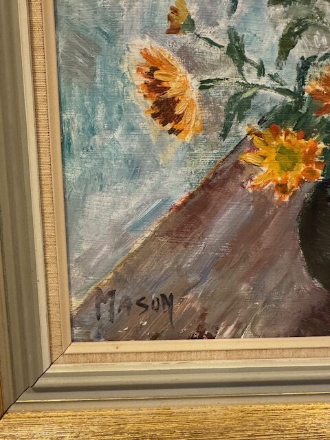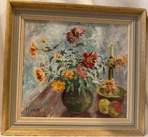 Cheerful midcentury oil painting on board, of vase with flowers (likely daisies) with a candlestick and some apples in the background. The muted blue and green background allows the yellow and red flowers to take centerstage. Signed Mason – Mats Mason is a listed Swedish artist who lived from 1894 to 1983. Solid gilded wood frame, in great condition.