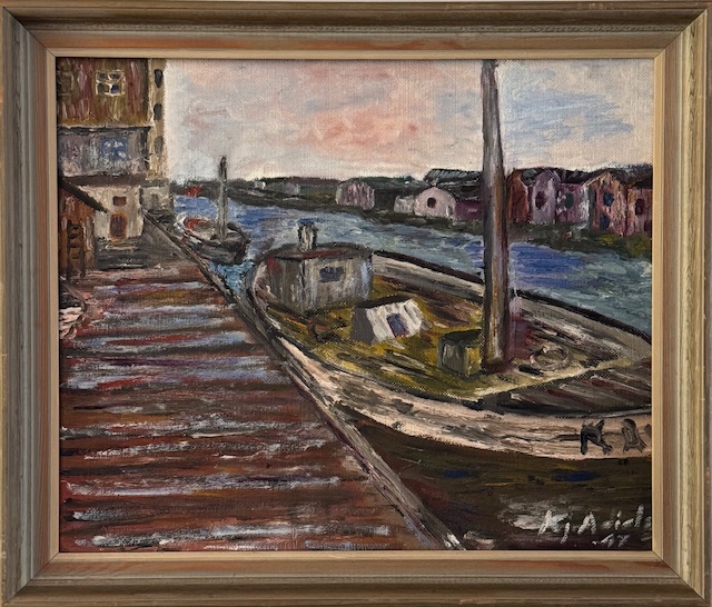 Midcentury, oil on board of boat docked in Scandinavian port – likely west coast Sweden or Denmark.