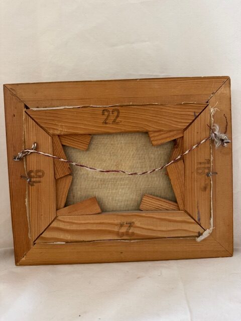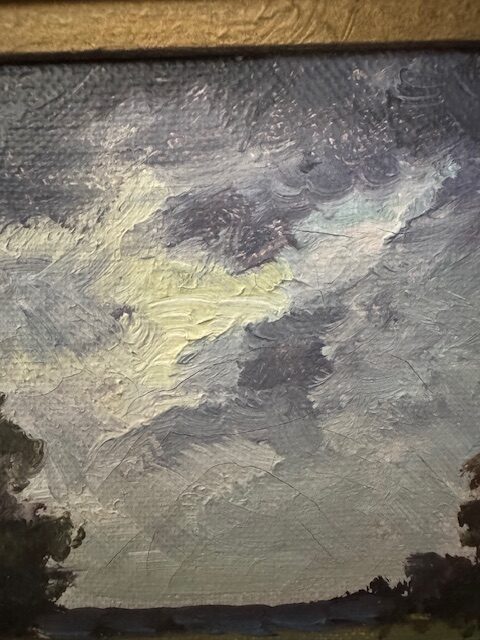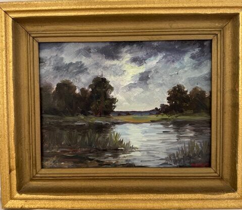 This beautiful, moody Swedish landscape of a lake and a sky just clearing in the middle to the painting, would make a beautiful addition to a bookcase (on a stand) or wall. The artists name is not decipherable but clues from the back of the painting make it probably that it was created in the second half of the 19th century. There is some light crackling in the clouds that can only been seen when shinning a light through the canvas.