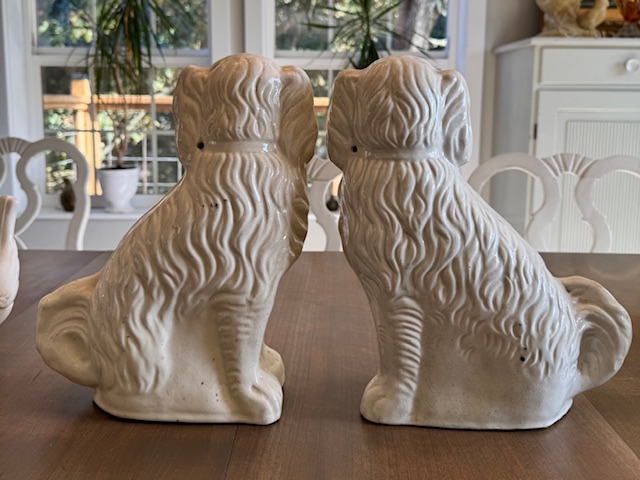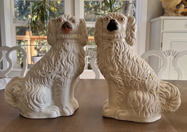 These are pair of older Staffordshire style King Charles mantel dogs. They are in good, vintage condition with no cracks, but with the expected fading of the gilding and other painting, especially around the nose area of the female dog. These were purchased in Sweden and had been in a manor house just north of Stockholm. They are ready for their new North American home and are eagerly awaiting adoption!