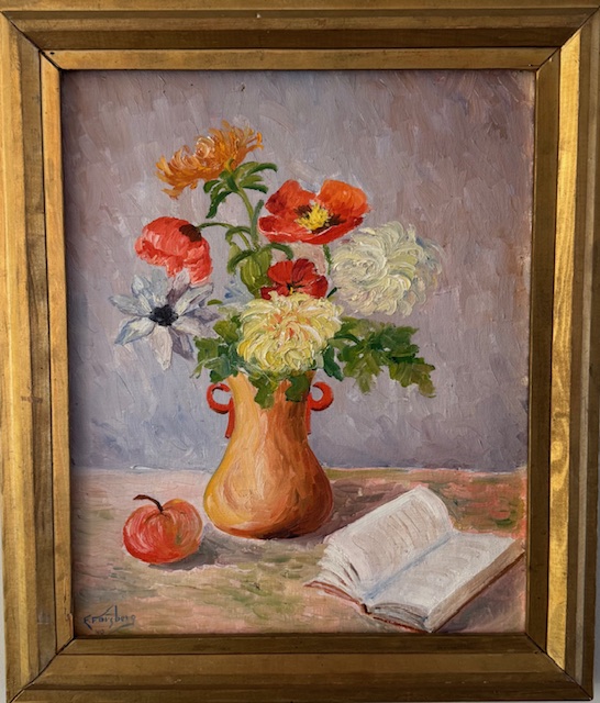 Vintage oil on canvas of flowers in a vase, with apple and book. The painting is signed E. Forsberg, 1940. Beautiful, cheerful colors – great addition to a floral gallery or as a stand alone.