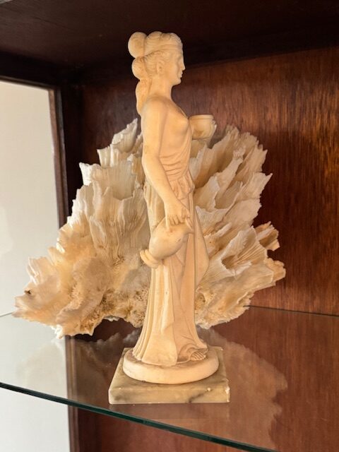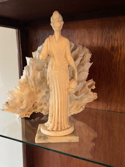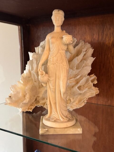 This is a vintage statute of the Greek goddess Hebe, known as the goddess of youth, who served as the cupbearer for the gods on Mount Olympus. The statute seems to be made from cast stone which is a composite stone mixture poured into molds. It stands on a marble base which has a couple smaller chips on its edges, consistent with its vintage age.